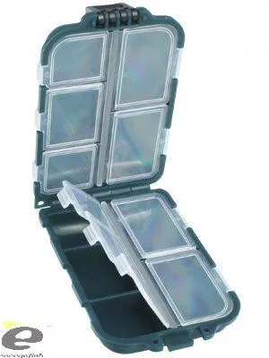Kutija za udice koja sadrži 6 manjih i 4 veća pretinca s pojedinačno zatvarajućim poklopcima, u kojima se mogu sortirati i skladištiti udice različitih veličina i ostali sitni predmeti bez opasnosti od miješanja.