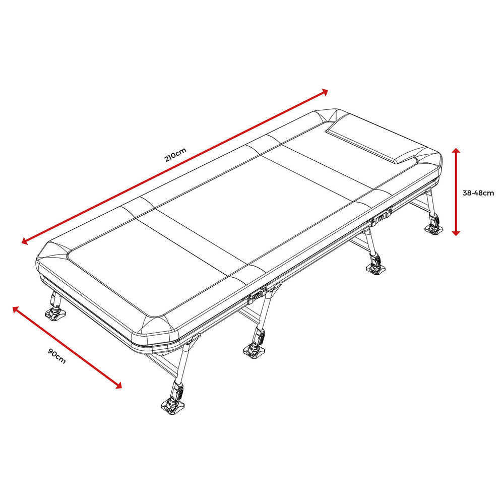 Precizno obrađeni aluminijski zglobovi osiguravaju stabilnost i trajnost kreveta. S gornjim dijelom od vodootporne EX tkanine od 20 000 mm. Zahvaljujući vodootpornom EX tkanini na gornjem dijelu, krevet pruža učinkovitu zaštitu čak i od jakih kiša. Ažurirani LevelTech sustav nogu osigurava ravnomjernu površinu za spavanje i drži krevet stabilnim. Dizajn drveta TLS pomaže da madrac bude potpuno ravan, čime se povećava udobnost. Luksuzni madrac od memorijske pjene pruža izvrsnu potporu i udobnost čak i tijekom dugih ribolovnih razdoblja. Vodootporni Heavy Duty EX gornji dio pruža dodatnu zaštitu krevetu. Dvoslojni reverzibilni jorgan povećava higijenske aspekte i udobnost.