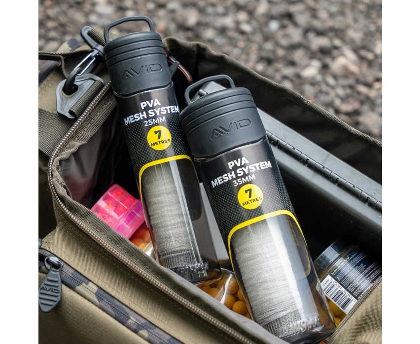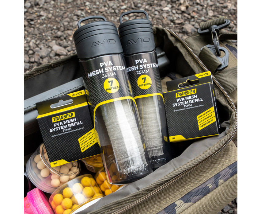 Avid Transfer PVA Mesh System 25mm je profesionalni set za punjenje PVA mreže, posebno razvijen za ciljano, kompaktno hranjenje. Ultra-fina PVA mreža od 25 mm, bez rasplitanja, idealan je izbor za sve vrste mamaca, uključujući crve, sitni pelet i boile. Srednje vrijeme otapanja osigurava da se mamac pouzdano otapa na svim temperaturama vode, a pritom ne ostavlja nikakve ostatke, čime ne uznemiruje ribe ili okoliš.