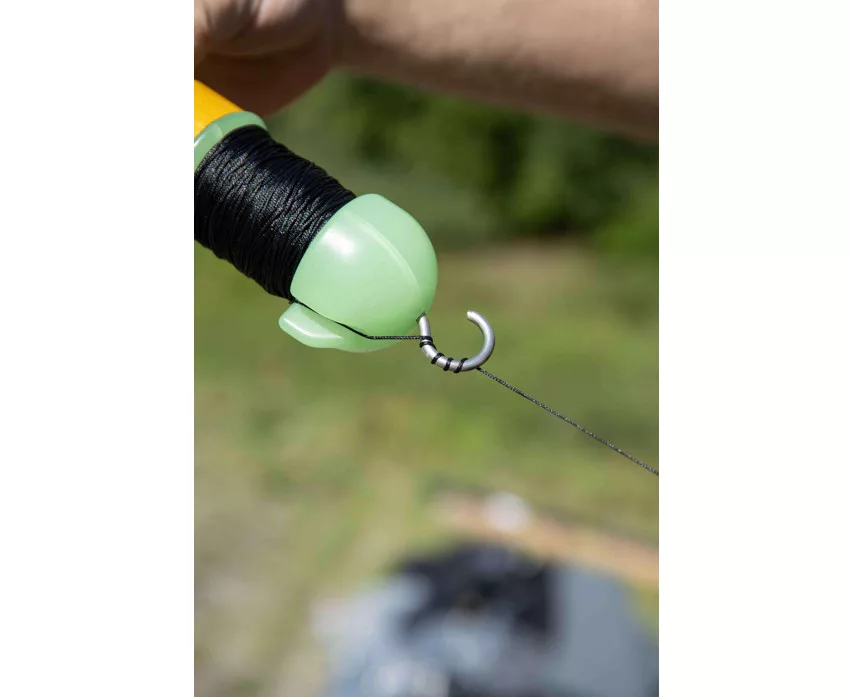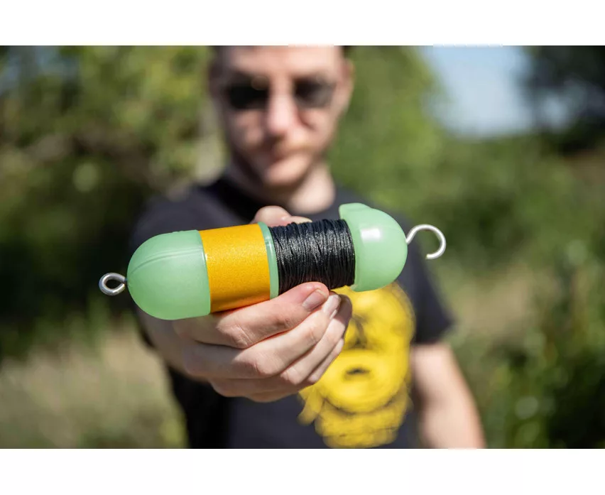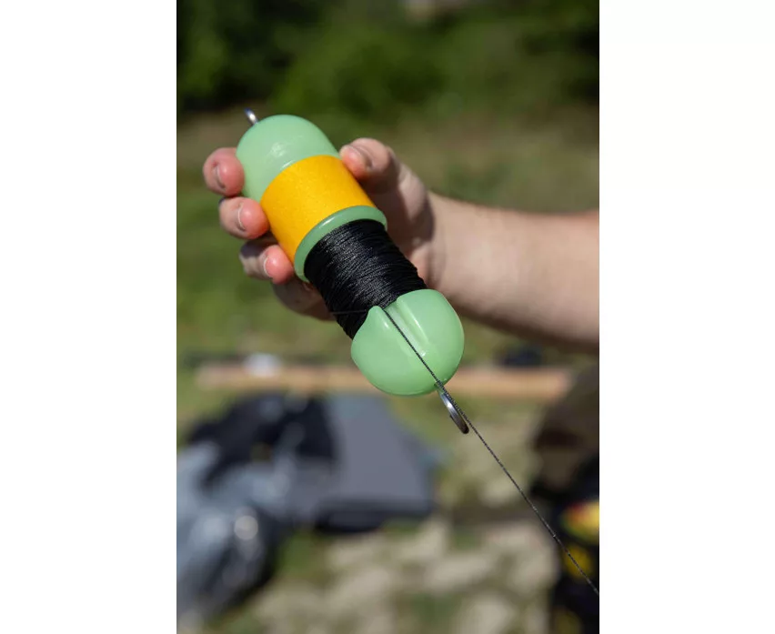 Središnja osovina od nehrđajućeg čelika opremljena je velikom kukom, što olakšava brzo i sigurno vezanje. Jedinstveni stoper strune u obliku peraje čvrsto drži strunu, sprječavajući njezino otpuštanje s role tijekom izvlačenja. Proizvod je unaprijed namotan s 20 metara pletene strune od 0,6 mm, tako da je odmah spreman za upotrebu. Glow (svjetleća) varijanta boja i reflektirajuće trake osiguravaju izvrsnu noćnu vidljivost, što je posebno važno tijekom ribolova u mraku.