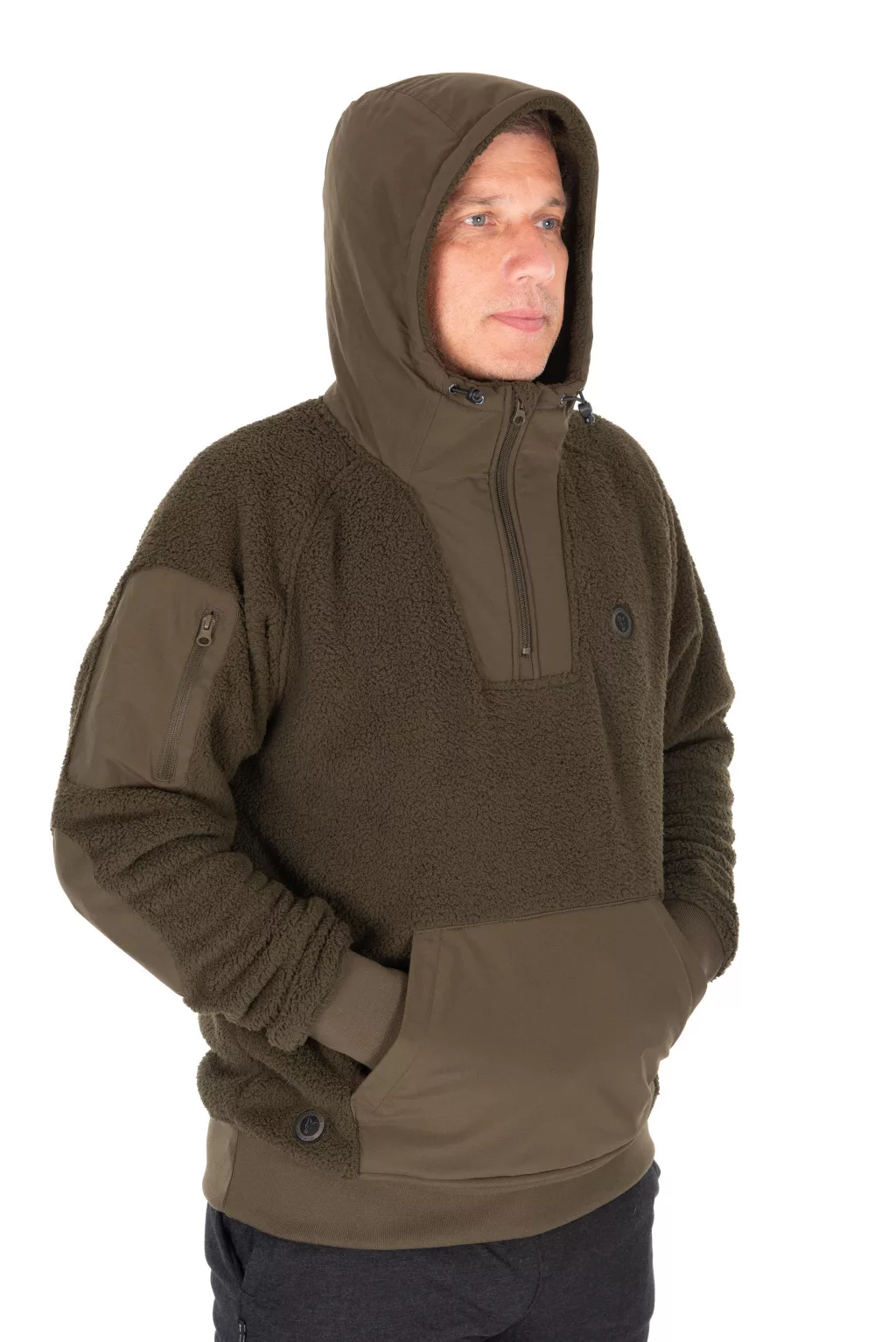 Fox Olive Sherpa Hybrid Jacket je stilski i funkcionalan gornji dio, dizajniran posebno za ribiče koji su aktivni na otvorenom. Maslinasto zelena boja jakne dobro se uklapa u prirodno okruženje, dok dizajn u Sherpa stilu pruža toplinu i udobnost u hladnijim danima. Gornji dio je izrađen od 100% poliesterskog materijala, koji je izdržljiv, lagan i dobro izolira, što ga čini idealnom odjećom za obalu.