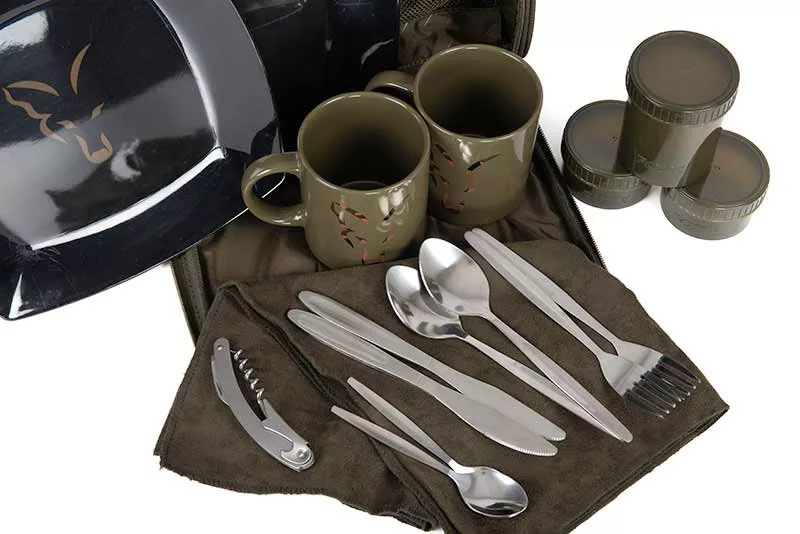Kompletni set posuđa za dvije osobe – pruža sav pribor koji vam može zatrebati tijekom ribolova. Izvrsna kvaliteta materijala – otporna na habanje, vodootporna poliesterska tkanina i pribor od nehrđajućeg čelika koji osiguravaju dug vijek trajanja. Stiliziran i udoban – praktične, podstavljene ručke i Fox Camo uzorak ne samo da dobro izgledaju, već osiguravaju i udoban transport. Savršene mogućnosti pohranjivanja – set uključuje više posuda i spremnika koji pomažu u organiziranom pohranjivanju i pripremi obroka.