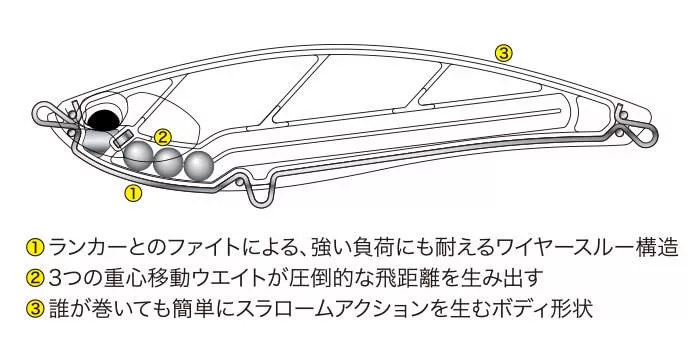 Varalica dizajnirana za obalni ribolov, izvrsna za vođenje. Njegovo visoko, ravno bočno tijelo s vodom koja teče od glave do leđa imitira kretanje slabih riba u plitkoj vodi, privlačeći brancina.