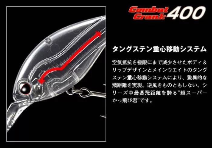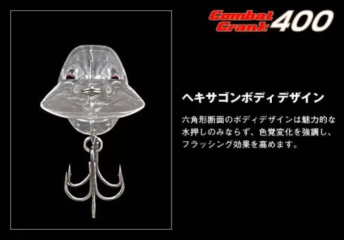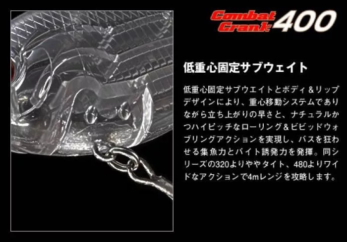 Evergreen Combat Crank 400 je plutajući vobler, posebno dizajniran da postigne dubinu ronjenja od 3,2-4,0 metra, što ga čini idealnim za hvatanje riba koje se zadržavaju dublje. Duljina od 6,8 cm i težina od 21 grama stvaraju savršenu ravnotežu između dalekih izbačaja i realističnog kretanja, imitirajući ozlijeđenu ribu mamac.