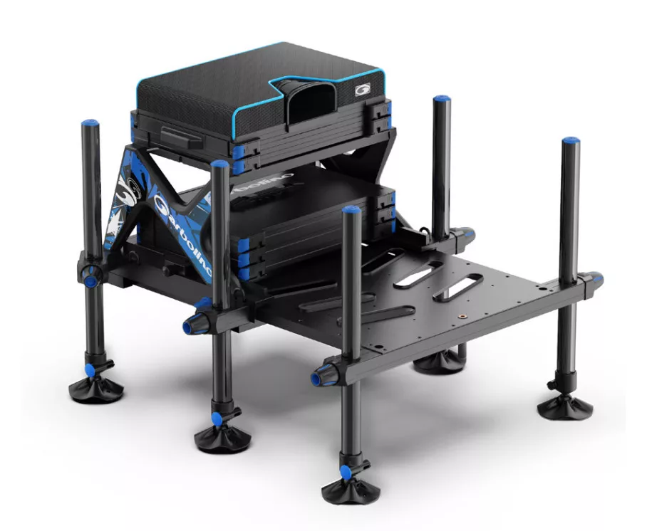 Konstrukcija okvira u obliku slova „X” temelji se na 6 crnih, eloksiranih PINLOCK teleskopskih nogu, što jamči optimalnu stabilnost na svakom terenu. AIRVENT ploča za pohranu, pametno smještena ispod okvira, nudi praktično rješenje za organizaciju opreme za ribolov s dugačkim štapom.