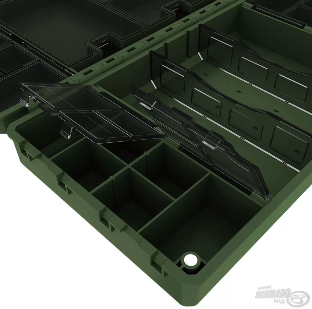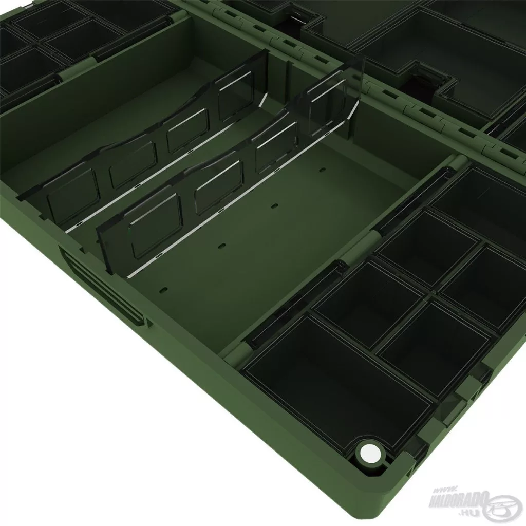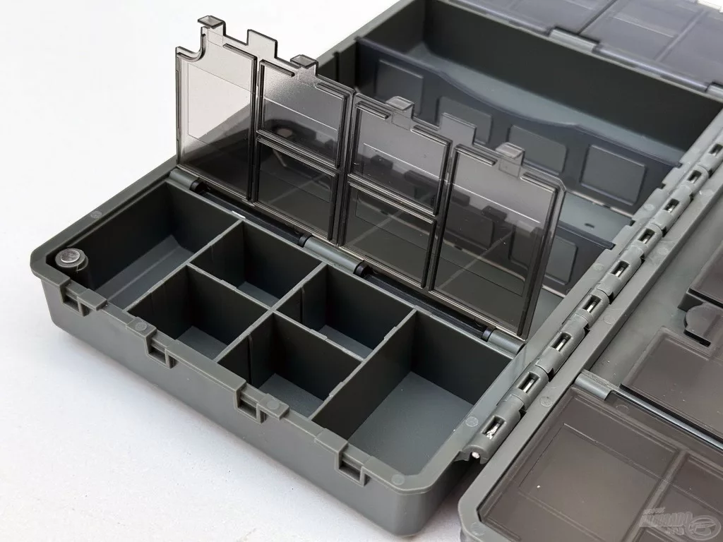 Jedna polovica kutije sadrži 27 zasebnih, pojedinačno otvarajućih pretinaca, koji su izvrsno prikladni za sigurno i pregledno pohranjivanje manjih dodataka – poput vrtilica, gumenih kapica, preokretača udica ili stopera. Prozirni poklopci pretinaca omogućuju da u trenu pregledate cijeli sustav, bez nepotrebnog traženja. Druga strana funkcionira kao veći, djelomično otvoreni prostor za pohranu, koji se po potrebi može prilagoditi pomoću 2 pregrade. Ovo je idealno rješenje za smještaj većih alata, poput olova, košarica ili manjih kutija za opremu.