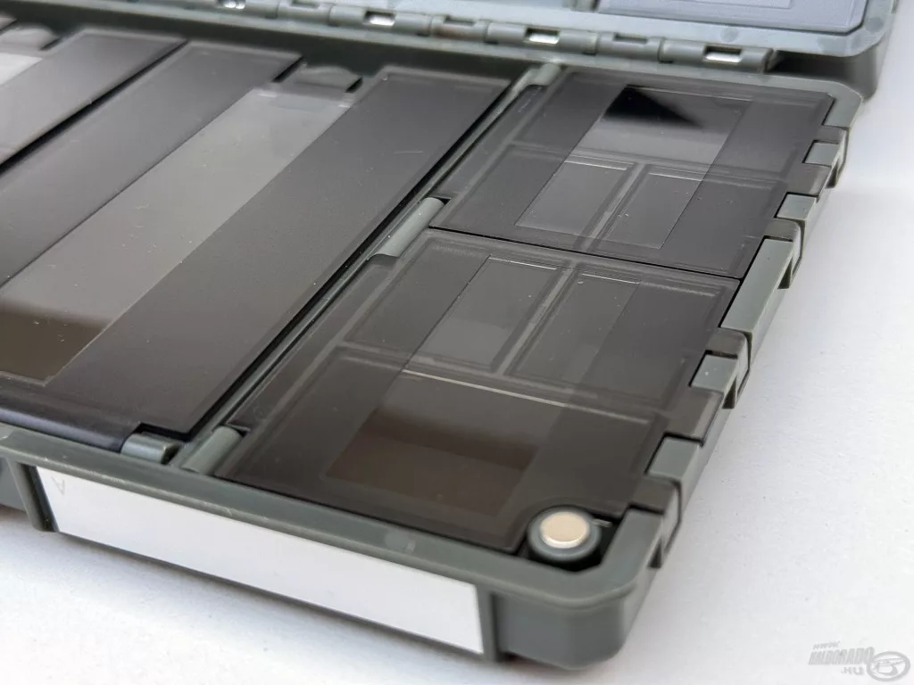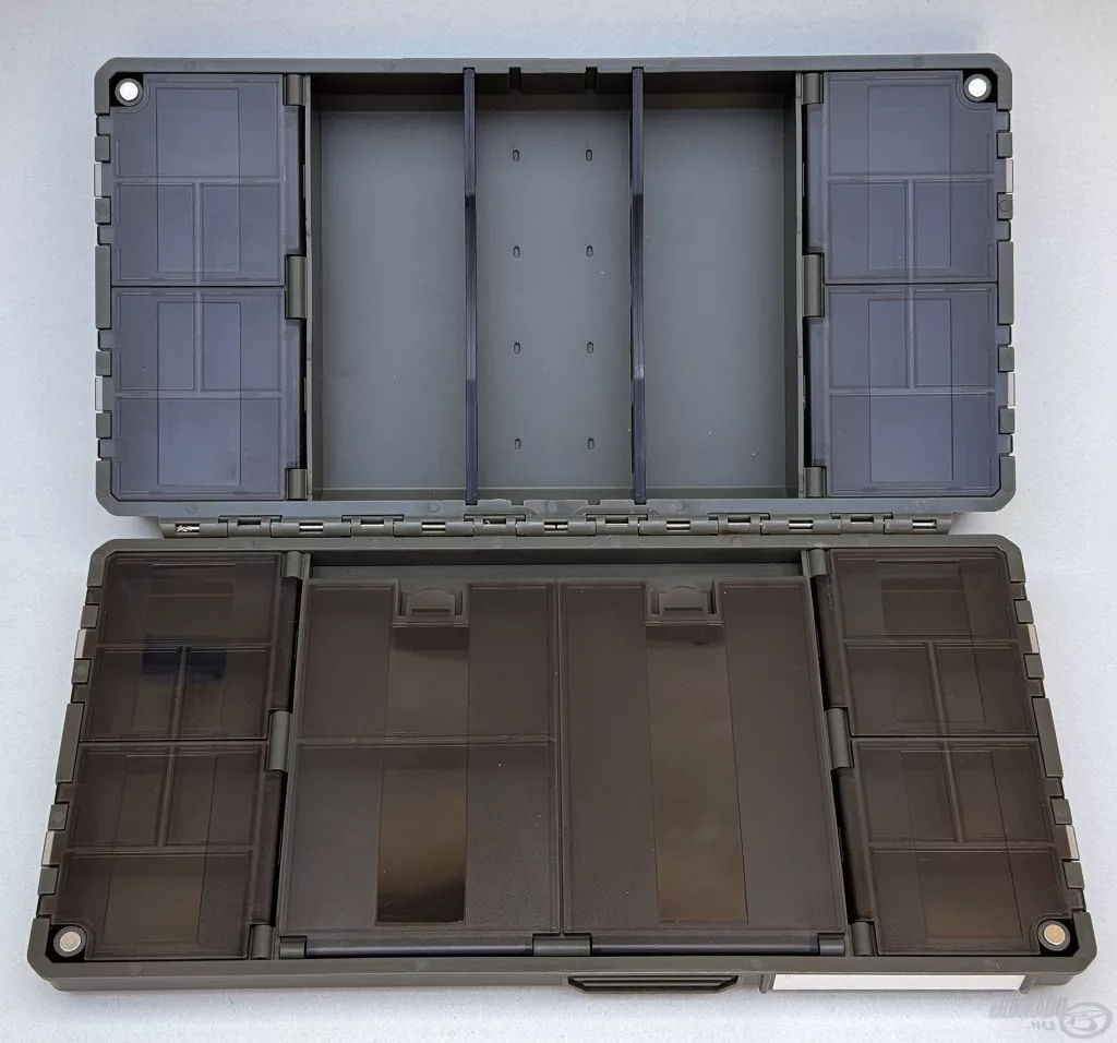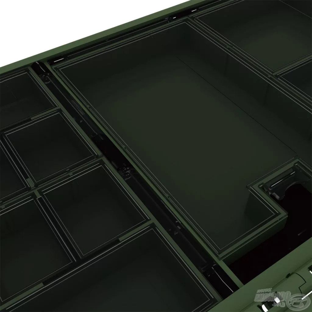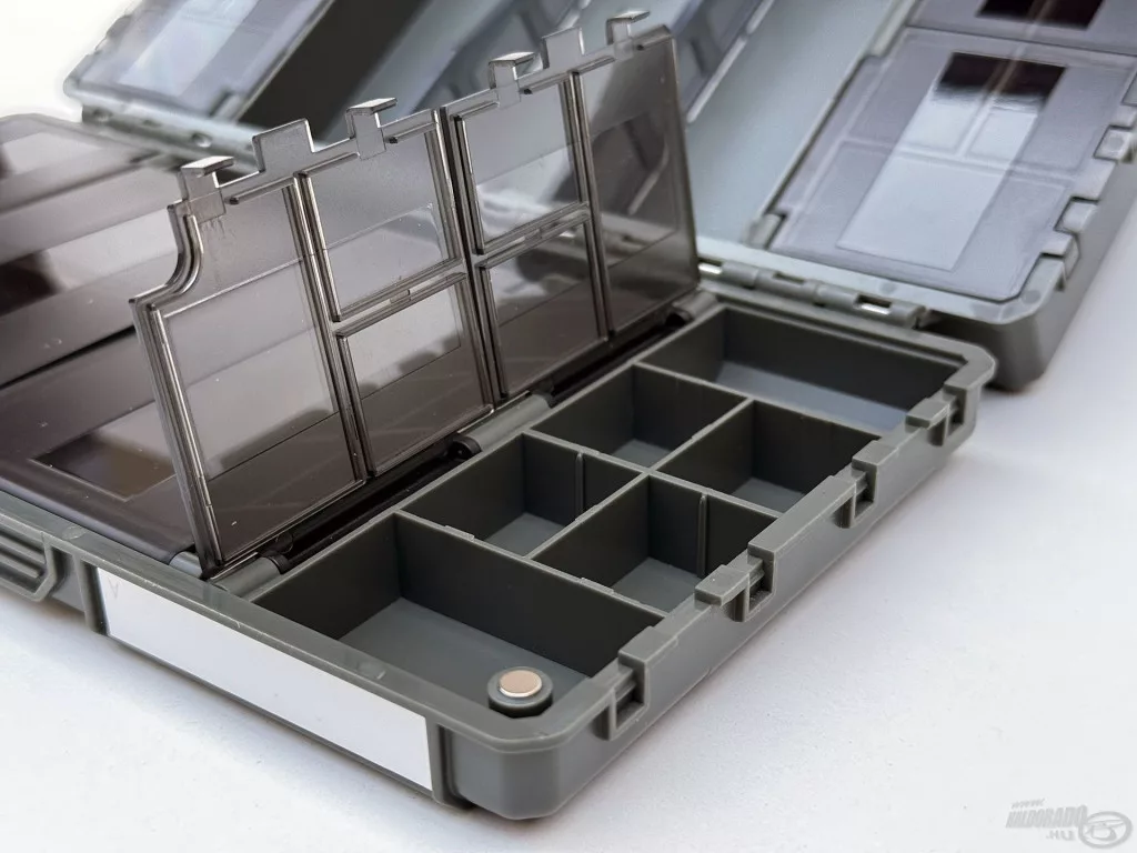 Jedna polovica kutije sadrži 27 zasebnih, pojedinačno otvarajućih pretinaca, koji su izvrsno prikladni za sigurno i pregledno pohranjivanje manjih dodataka – poput vrtilica, gumenih kapica, preokretača udica ili stopera. Prozirni poklopci pretinaca omogućuju da u trenu pregledate cijeli sustav, bez nepotrebnog traženja. Druga strana funkcionira kao veći, djelomično otvoreni prostor za pohranu, koji se po potrebi može prilagoditi pomoću 2 pregrade. Ovo je idealno rješenje za smještaj većih alata, poput olova, košarica ili manjih kutija za opremu.