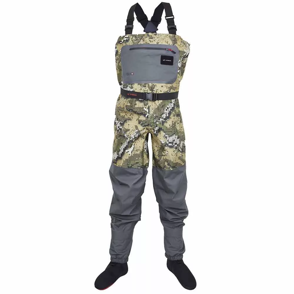 JMC  vodootporne hlače za gaženje pružaju odgovarajuću zaštitu za višesatni ribolov u rijeci, držeći nas suhima. Hydrox® mikrovlakana materijal, s vodonepropusnim šavovima. Vodootporne su i prozračne, a svi su šavovi ojačani. Gornji dio je izrađen od 3, a donji od 4 sloja, vrlo otpornih na habanje. Pružaju savršenu udobnost tijekom cijelog dana ribolova. Podesive naramenice omogućuju jednostavno pretvaranje u hlače. Opremljene su velikim prsnim džepom i unutarnjim džepom. Lagane su i udobne, pružaju veliku slobodu kretanja. Papuče su izrađene od neoprena dvostruke gustoće, s protukliznim umetcima. Kamuflažni uzorak osigurava da ostanemo neprimijećeni u okolini. Praktičan remen za udobnost.