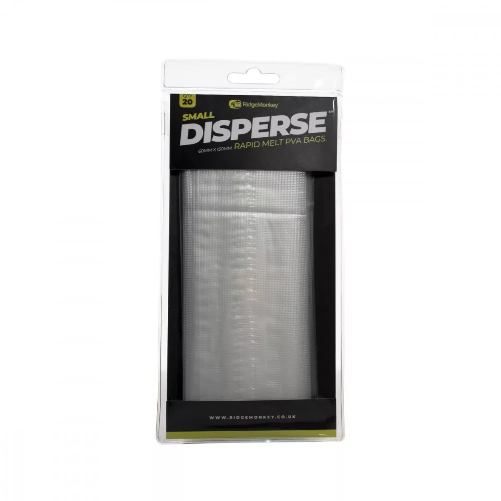 RidgeMonkey Disperse PVA vrećica - RidgeMonkey Disperse PVA vrećice su jedna od novosti RidgeMonkeya iz 2020. godine. Njihov materijal je premium kvalitete, iznimno jak, reljefni filmski sloj. Brzo se otapaju i ostavljaju vrlo minimalnu količinu PVA materijala, tako da ne izazivaju sumnju ni kod opreznih šarana. Proizvode se u više veličina, stoga su pogodne za koncentrirano hranjenje oko manjih udica, kao i za unošenje većih peleta.